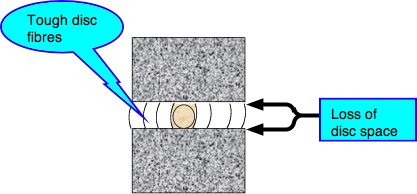 But, in fact, what was happening? Each time the bubble of gel in the centre of disc, the incompressible fluid that keeps the bones of the spine, the vertebrae, apart was partially lost. This allowed the vertebra above to settle deeper on its mate below.