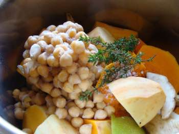 Toss a packet of cooked chickpeas into the pressure cooker, and I've added a couple strands of thyme; you can't see the star anise. And of course you could add some garlic and whatever.