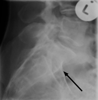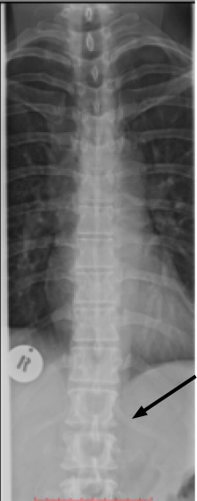 An lateral xray of the lower back reveals an unusual alteration in the normal lordosis at the thoraco lumbar junction; nothing specific but confirming her extreme sensitivity in the region.