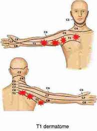 Deep pain in the left medial/superior angle of the scapula with pain intermittently to the inside left elbow.